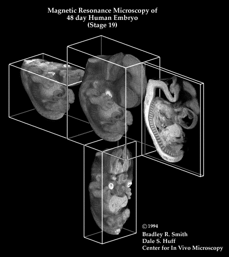 These are some wonderful Magnetic Resonance Images generated by Brad Smith of both mouse and human embryos and are reproduced with his permission here. I would ask you to use this page as a Link to his Embryology Homepage with even more images available. He has also developed a "Digital Atlas of Mouse Embryology" available also on CD.