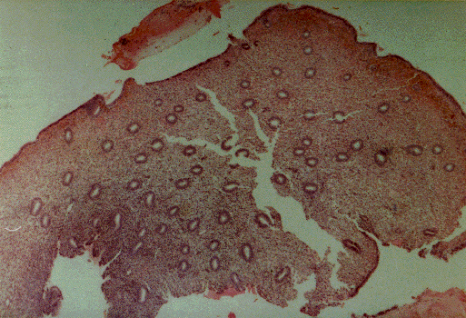 Mid-Proliferative Increasing levels of estrogens cause a thickening of the endometrium during this phase of repair and proliferation. A continuous surface epithelium grows from glandular remnants in the stratum basale and covers the endometrium. The stroma is compact and the glands increase in number, length and by regeneration from glandular remnants. |