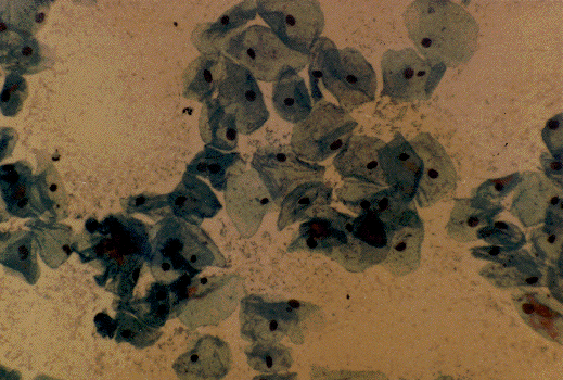 Stratum corneum (eosinophilic, red) and stratum spinosum (basophilic, blue) cells throughout the menstral cycle.