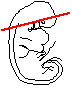 B1,B2: Pharynx. Crest in ventral floor of pharynx formed by fusion of 3rd pharyngeal arches = hypopharyngeal eminence (precursor of root of tongue). Rathke's pouch = rudimentary adenohypophysis.