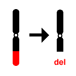 | Deletion | del | Loss of all or part of one chromosomal arm, usually a part toward the end of an arm. An acentric chromosome (without a centromere) is typically lost completely after a few cell divisions. Examples: 46, XX, 4p- or 46, XX, del(13)(q12q14)