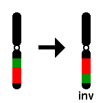 | Inversion | inv | Two break points in a chromosome allow a 180 degree turn of a segment with fusion. The inversion is "paracentric" if it only involves one arm, while "pericentric" inversions involve the centromere and parts of p and q arms. Example: 46, XX, inv(8)(p23q22)