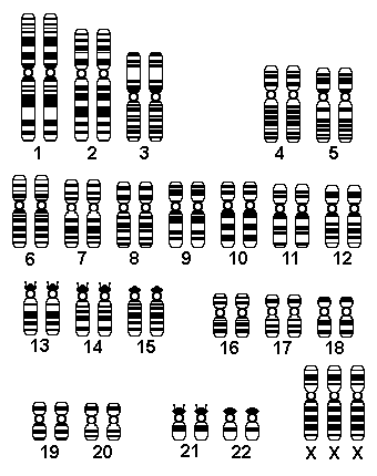 This diagram displays the 47, XXX karyotype of a triple X female. This occurs in about 1 in 1000 female livebirths. Affected females are typically normal, though some have mental retardation with speech and language problems.