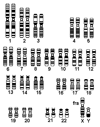 This diagram displays fragile X syndrome. This occurs in about 1 in 1500 males. Affected female carriers are typically normal. Most of the affected males have mental retardation, and their testes are larger than normal.