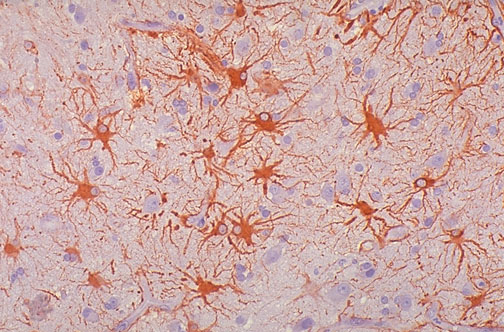Processes can be seen with glial fibrillary acidic protein (GFAP) stain of normal brain.