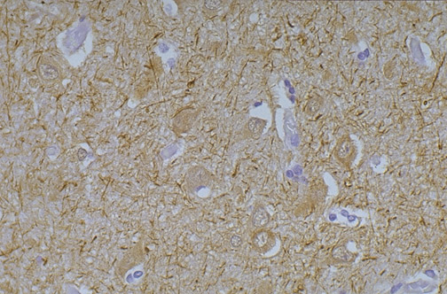 This section of normal cerebral white matter shows positivity with the neurofilament stain to demonstrate processes.