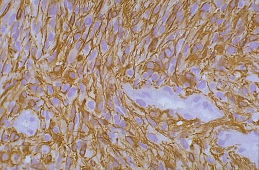 Cells of a glioblastoma multiforme of brain, a malignant glial neoplasm are positive with the glial fibrillary acidic protein (GFAP) stain, which highlights the cell processes.