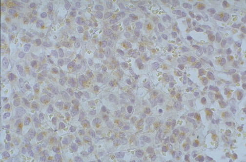 This large cell lymphoma demonstrates positive immunoperoxidase staining with antibody to CD-30 (Ki-11). CD-30 is a marker for Hodgkin's and large cell non-Hodgkin's lymphomas, and its presence implies a worse prognosis.