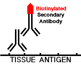 The section is then washed to remove any unbound primary antibody. Then the secondary antibody, which is typically another mammalian species directed against the species of the primary antibody, is applied to the tissue section. This secondary antibody is "biotinylated" or complexed with biotin, a low molecular weight vitamin compound. The tissue is incubated with this secondary antibody, which will attach to any specific primary antibody that is present, as shown below: