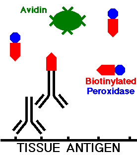 During incubation, the avidin then complexes with the biotinylated secondary antibody, localizing it to a specific site in the tissue, and biotin with peroxidase also attaches to the avidin. Thus, the avidin-biotin-conjugate (ABC) complex is formed, as illustrated below:
