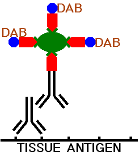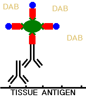 The peroxidase utilized must be attached to the secondary antibody, and it is the localization of this peroxidase in the tissues that provides the ability to identify specific components. The peroxidase must act upon a compound to produce the chromogen. Most ofen, the compound utilized is diaminobenzidine tetrahydrochloride (DAB). A visible insoluble dark brown precipitate is formed by DAB in the presence of peroxidase.