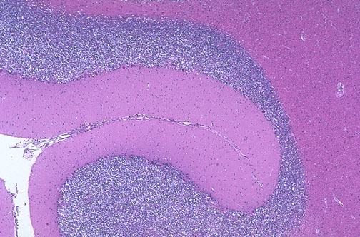Normal cerebellum is seen here at low magnification, with the folia having the dark blue granule cell layer and the pink molecular layer, and scattered Purkinje cells between.