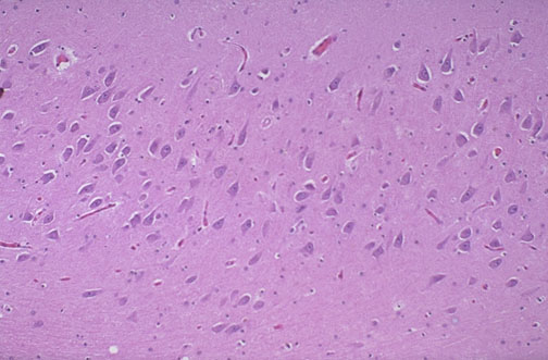 Normal hippocampus with neurons is seen at medium power.