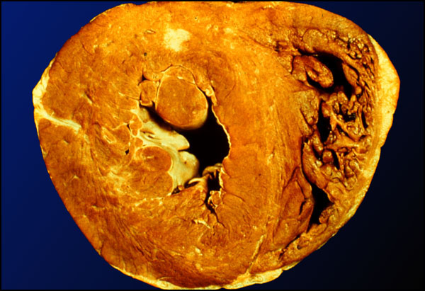 The cross-sectioned heart of a hypertensive man shows marked thickening of the entire left ventricle. The wall of the right ventricle is also thickened, but not so much as the left ventricle. The papillary muscles are also thickened.