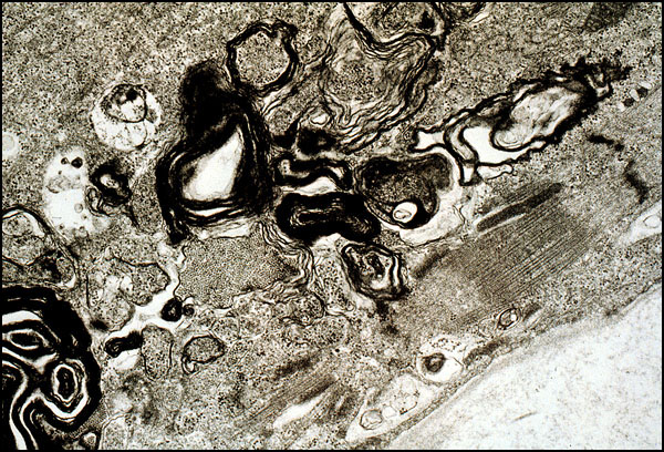 This EM photo shows numerous whorls of membranes ("myelin figures"), indicative of cell injury. Myofilaments and mitochondria appear normal.