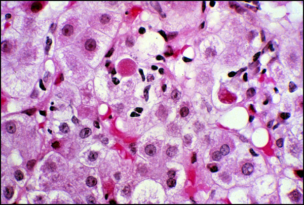 This slide from a liver biopsy of a patient suffering from viral hepatitis shows an acidophilic body amidst of smaller hepatocytes that have well preserved contours and vacuolated cytoplasm. Acidophilic bodies are an example of apoptosis, i.e., induced, often programmed individual cell death. Vacuolar change is reversible.
