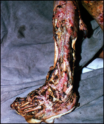 was induced by ischemia, the result of an overly eager application of a tourniquet to stop arterial bleeding induced by a stab wound.