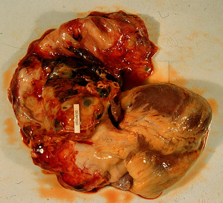External view of the heart and the arch of the aorta shows marked widening of the entire arch. The fat and the surrounding connective tissue have not been dissected from the aorta.