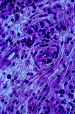 In the deep media, and adventitia, the small blood vessels (vasa vasorum) are surrounded by infiltrates of plasma cells and lymphocytes and the endothelial cells appear swollen. This obliterative endarteritis leads to focal ischemic necrosis of the wall of the aorta.