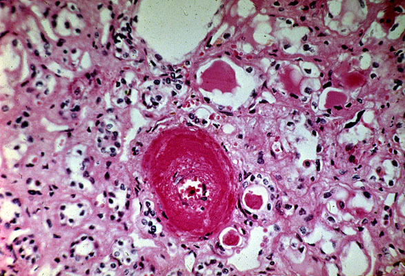 . The wall of the arteriole appears magenta red due to fibrin that has impregnated its wall.