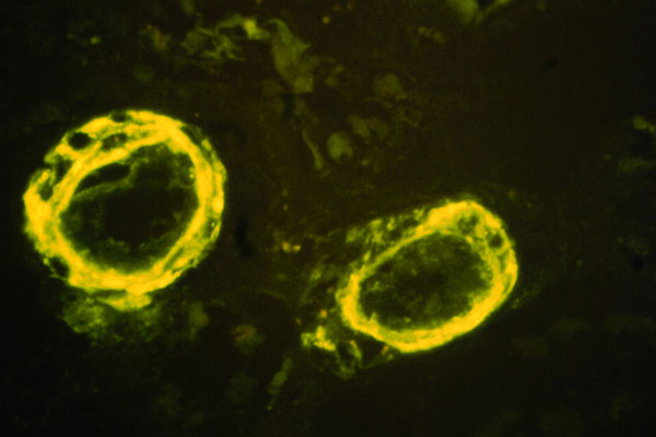 Malignant hypertension, immunofluorescence with antibody to fibrin