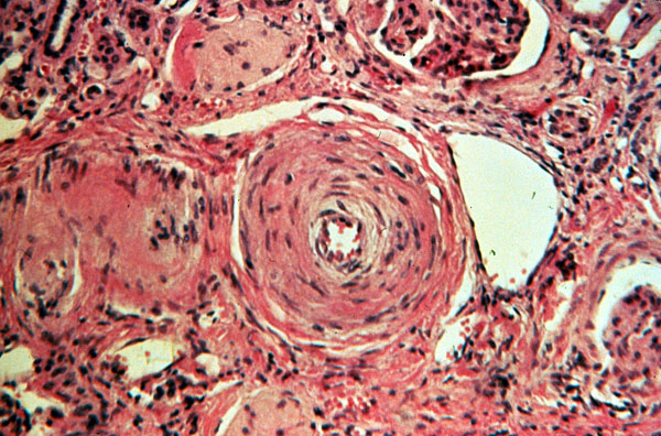 The renal arteriole shows concentric layering of the smooth muscle cells ("onion skin like appearance").