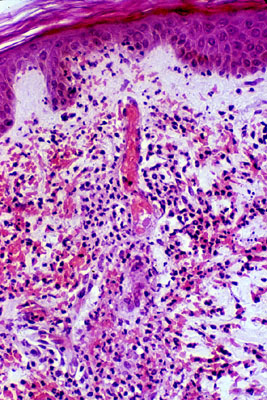 The dermis contains prominent infiltrates of leukocytes, mainly neutrophils, which are centered around small blood vessels. Other features are extravasation of red cells and nuclear dust (fragments of nuclei).