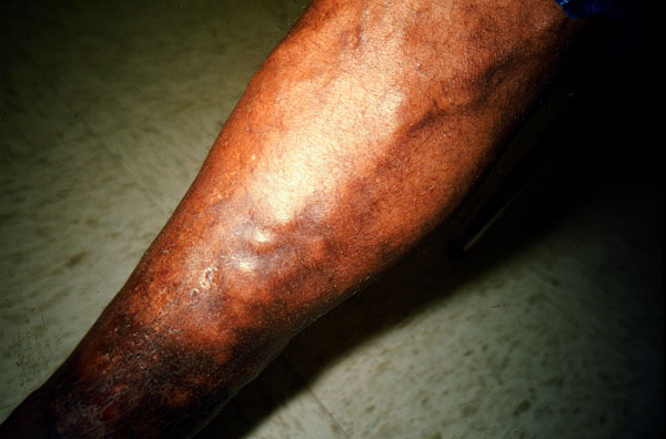 The leg shows dilated and tortuous subcutaneous veins.
