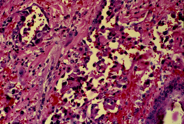 contain blood. These spaces are lined with markedly atypical cells which focally protrude into the vascular lumen.