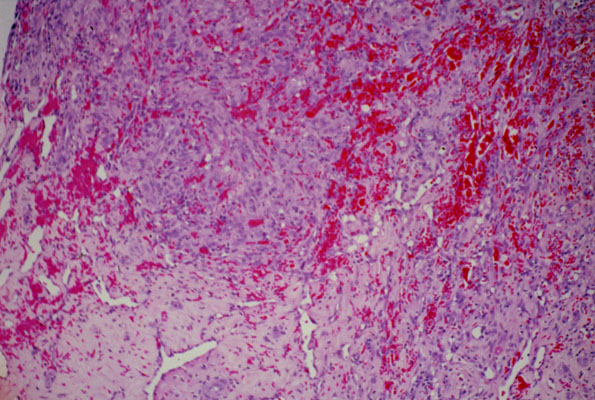 The lesion consists of elongated cells which line vascular slit-like spaces and form solid nests. In between these cells, there are numerous extravasated red blood cells. Towards the periphery, the vascular spaces are more dilated.
