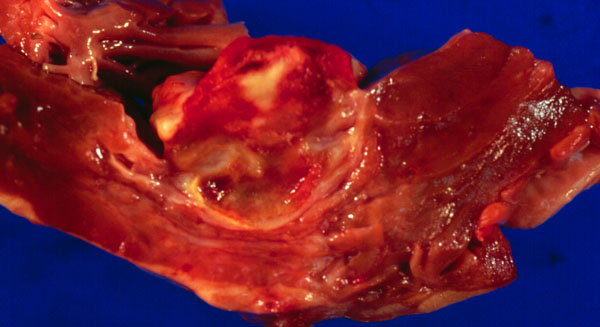 Mural thrombus overlying a healed infarct of the left ventricle. On cross section one may see that the thrombus is firmly attached to the endocardial surface of the ventricle. The gray tissue corresponds to fibrosed granulation tissue that has ingrown into the thrombus from the endocardial surface and has partially organized it.