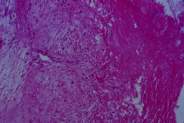 , chronic, histology. The valve is deformed and thickened by fibrotic