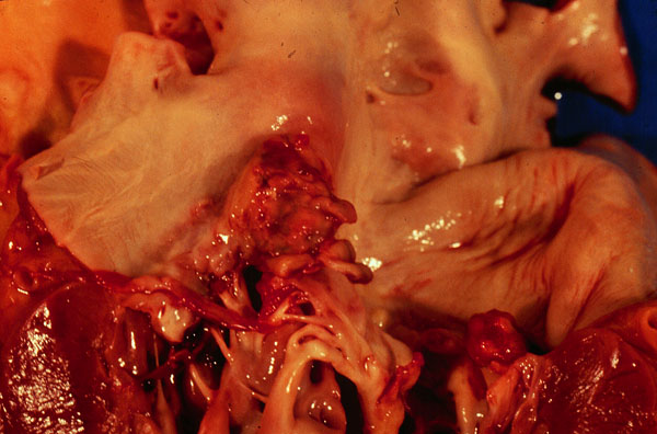 Bacterial endocarditis superimposed on chronic rheumatic endocarditis. The valve is covered with copious vegetations. There is focal destruction of leaflets. Thickening of the chordae tendineae is evidence of healing chronic rheumatic endocarditis.