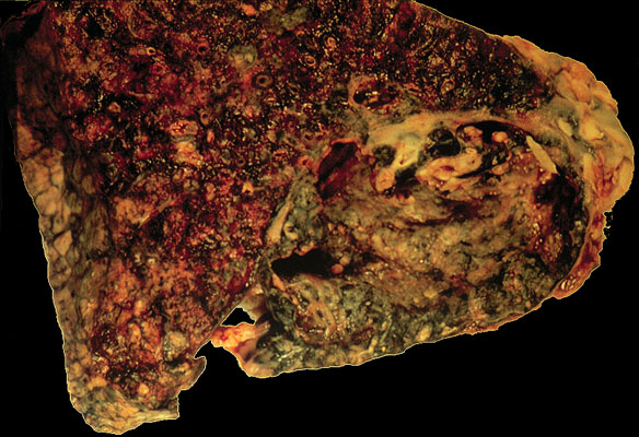 One of the complications of bacterial pneumonia is shown on this slide, in which tissue destruction and necrosis has resulted in a large upper lobe abscess. An abscess can be defined as a localized suppurative process with necrosis of lung parenchyma.