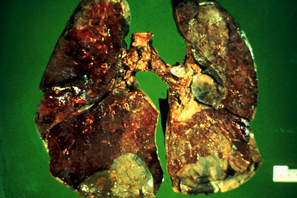 The gross findings in Wegener's granulomatosis are variable and may show: Massive hemorrhage, Zonal consolidation, or Necrotic nodules with or without cavitation. This slide shows multiple necrotic nodules.
