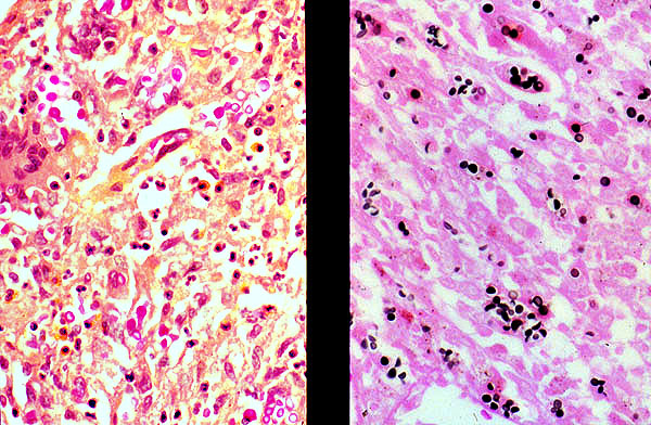 Cryptococcus neoformans, mucin stain and silver stain. On silver stain the organisms appear as small, black, irregular budding yeast. On mucin stain, the organisms appear as reddish pink budding yeast. This is one of the rare fungal elements that stain with mucin stain and this can be used to presumptively classify this organism histologically.