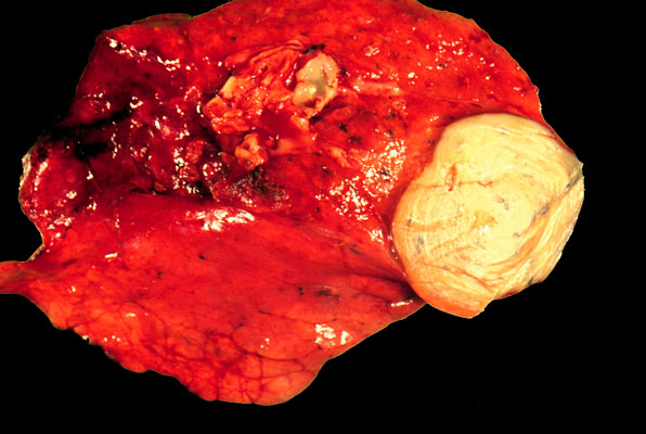 This mass-like lesion is the typical appearance of a histoplasmoma, (or other fungal granuloma). Typical features include sharp circumscription with concentric lamellae, resembling a cross section of a tree.