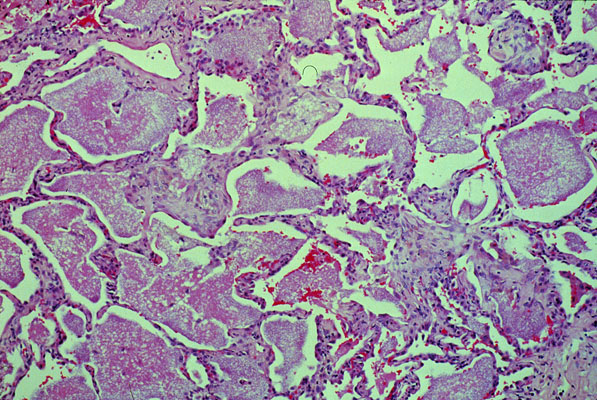 There is evidence of an interstitial pneumonitis; however, the most characteristic and prominent feature is the intra-alveolar frothy exudate. Alveolar spaces are filled with pink bubbly relatively acellular material forming cast-like structures.