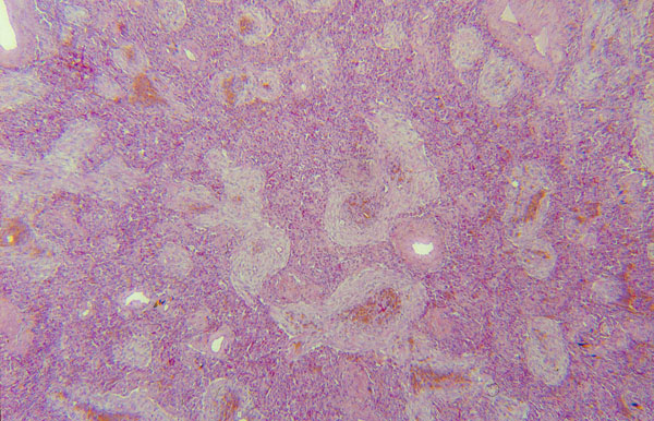 Bronchiolitis obliterans - organizing pneumonia (BOOP) is a predominantly airspace filling process. There is a distinct type of patchy fibrosis composed of polypoid irregular plugs of fibrous tissue filling bronchioles, alveolar ducts, and alveoli. These plugs of fibrous tissue are light staining and assume the serpiginous shapes of the air apaces that they fill.