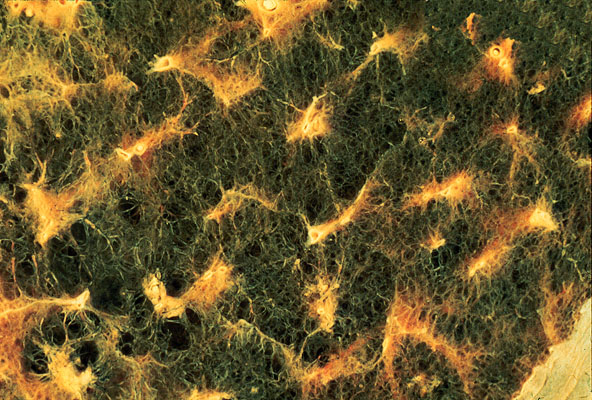 This example of panlobular emphysema shows enlarged airspaces, accompanied by destructive changes, involving the entire lobule. Usually, anthracotic pigmentation is not as prominent as in centrilobular emphysema, and the changes tend to be most severe in the lower lung zones.