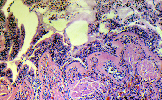 Typical microscopic features in the bronchi of asthmatic patients include thickening of the basement membrane, inflammatory infiltrates with eosinophilia, hypertrophy and hyperplasia of submucosal glands, hypertrophy of smooth muscle, goblet cell metaplasia, and luminal plugs composed of mucus, shed epithelial cells, and inflammatory cells. This slide of a bronchus shows prominent thickening of the basement membrane, inflammatory infiltrates with eosinophilia, and shed luminal epithelial and inflammatory cells.