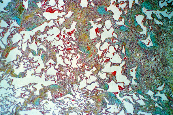 This is an interstitial inflammatory and fibrosing lesion characterized by marked variation in the degree of lung involvement and temporal heterogeneity. Notice some areas of normal lung tissue with thin delicate alveolar walls, and other areas where alveolar walls appear markedly thickened by interstitial chronic inflammation and fibrosis. This is a trichrome stain and areas of fibrosis stain green-blue.