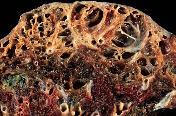 Honeycomb lung, gross appearance. There is marked restructuring of lung tissue with extensive fibrosis and cyst formation. This grossly might be difficult to distinguish from changes of emphysema.