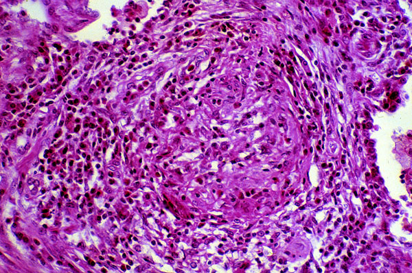 Wegener s granulomatosis. Higher power. There is a predominance of chronic inflammation, with histiocytic proliferation, and a poorly formed non-caseating granuloma. Wegener s granulomatosis is characterized by necrotizing granulomatous inflammation and a necrotizing vasculitis.