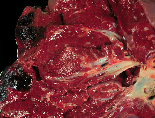 The deep red wedge shaped firm area represents a pulmonary infarct, which is the result of a pulmonary embolus. Infarcts are pyramidal in shape, with the base of the pyramid on the pleural surface. Because of the dual blood supply to the lung, most small pulmonary emboli do not produce infarcts.
