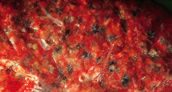 Bronchioloalveolar carcinoma, gross appearance. Bronchiolo alveolar carcinomas may have two possible growth patterns: 1) a solitary mass-like lesion or 2) a multicentric or diffuse type of growth pattern. This slide demonstrates the multicentric or diffuse growth pattern where the tumor is barely discernible as ill-defined small whitish slightly firm nodules or infiltrates. This tumor may grossly and radiographically resemble a pneumonic infiltrate, and thus clinically and radiographically may be misdiagnosed as pneumonia rather than tumor.