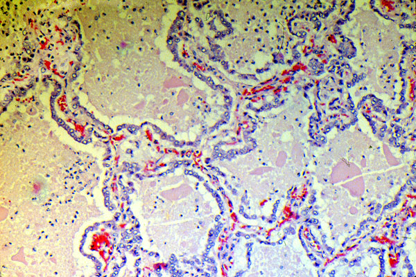 This is the typical microscopic appearance of a bronchioloalveolar carcinoma. It is distinguished from all other lung tumors by the preservation of the pre-existent lung architecture. Cuboidal to columnar shaped neoplastic cells line up on the pre-existent alveolar septa with little or no fibrosis and little cellular pleomorphism or anaplasia.