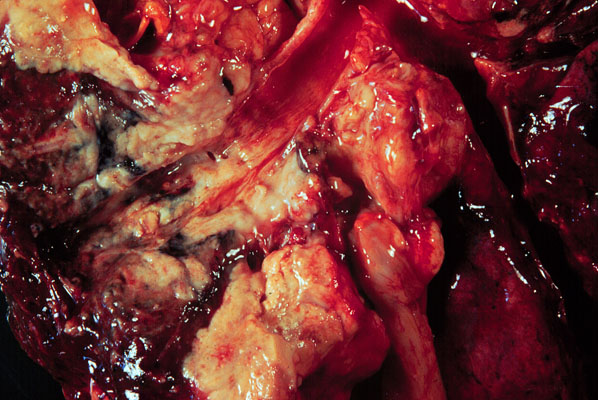 This is a gross example of small cell carcinoma of the lung. Like squamous cell carcinoma, small cell carcinoma is usually centrally located and is closely associated with smoking. On this slide, the bronchial tree has been opened, and tumor is noted within the opened bronchus as well as the surrounding lung parenchyma.