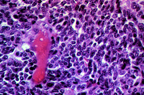This is the typical microscopic appearance of small cell carcinoma. It differs from other tumors by the much smaller size of the cells and scanty amount of cytoplasm. The size of these tumor cells is approximately one and a half to two times the size of a normal lymphocyte. The intermediate type of small cell carcinoma is approximately one and a half to two times the size of the oat cell type of small cell carcinoma.
