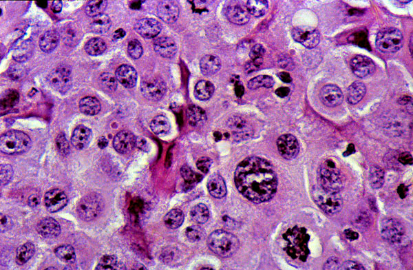 Large cell carcinoma, microscopic appearance. This tumor is composed of large malignant cells without evidence of squamous or glandular differentiation. Mucin stains were negative. This tumor could be classified as a large cell carcinoma or as a poorly differentiated carcinoma, non-small cell type. If the mucin stain had been positive in this tumor, it would have been classified as a poorly differentiated adenocarcinoma (solid type).